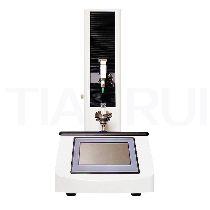 胶塞穿刺力是指在刺穿胶塞过程中需要的峰值。胶塞穿刺力测试仪配有上、下两个夹具,其中上夹具可按照设定的夹具分离速度上、下移动,且配置有力值传感器,在测试样品的抗穿刺力时,穿刺针安装在上夹具中,按照设定的速度向下移动,将试样刺穿,力值传感器则能够实时测试并显示穿刺过程中的力值,从而得到样品的抗穿刺力。